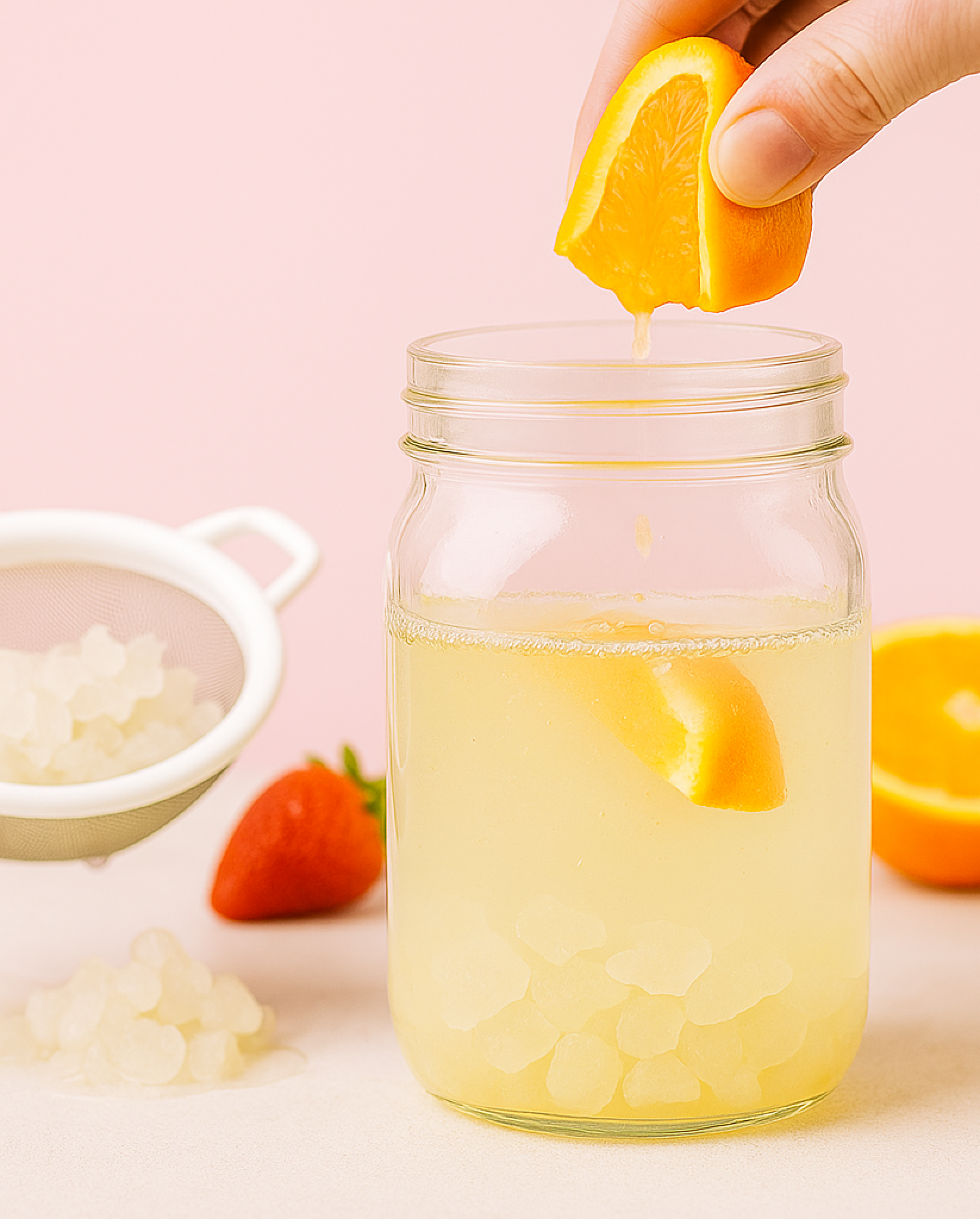 Na rozdíl od kombuchy nejsou potřeba žádné čajové kultury ani houby – tibi zrna stačí zalít cukrovou vodou, nechat fermentovat a sledovat, jak ti na kuchyňské lince vzniká živý, osvěžující nápoj.